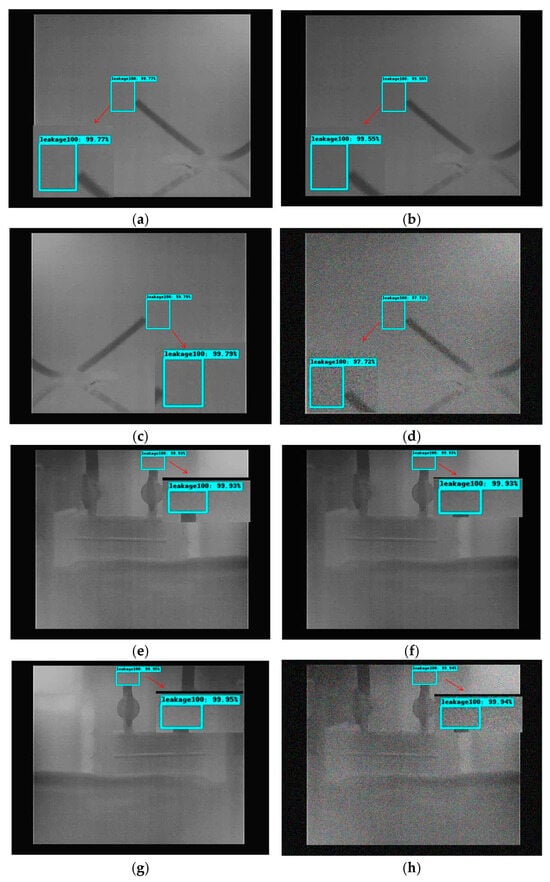 Detection results of the Gas R-CNN model: (a) Scene 1 (original image); (b) Scenario 1 (brightness transformation); (c) Scenario 1 (Gaussian blur); (d) Scenario 1 (horizontal flip); (e) Scenario 2 (original image); (f) Scenario 2 (brightness transformation); (g) Scenario 2 (Gaussian blur); (h) Scenario 2 (horizontal flip).