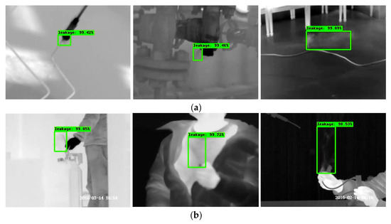 It is shown that background and environmental disturbances can lead to a degradation of the detection effect. From Table 1, it can be seen that the AP of the proposed model is 96.47% at a leakage volume of 100 mL/min, whereas the AP of the original Faster R-CNN model is 81.44%. The proposed model showed a better detection performance with high generalization ability in the overall testing environment.