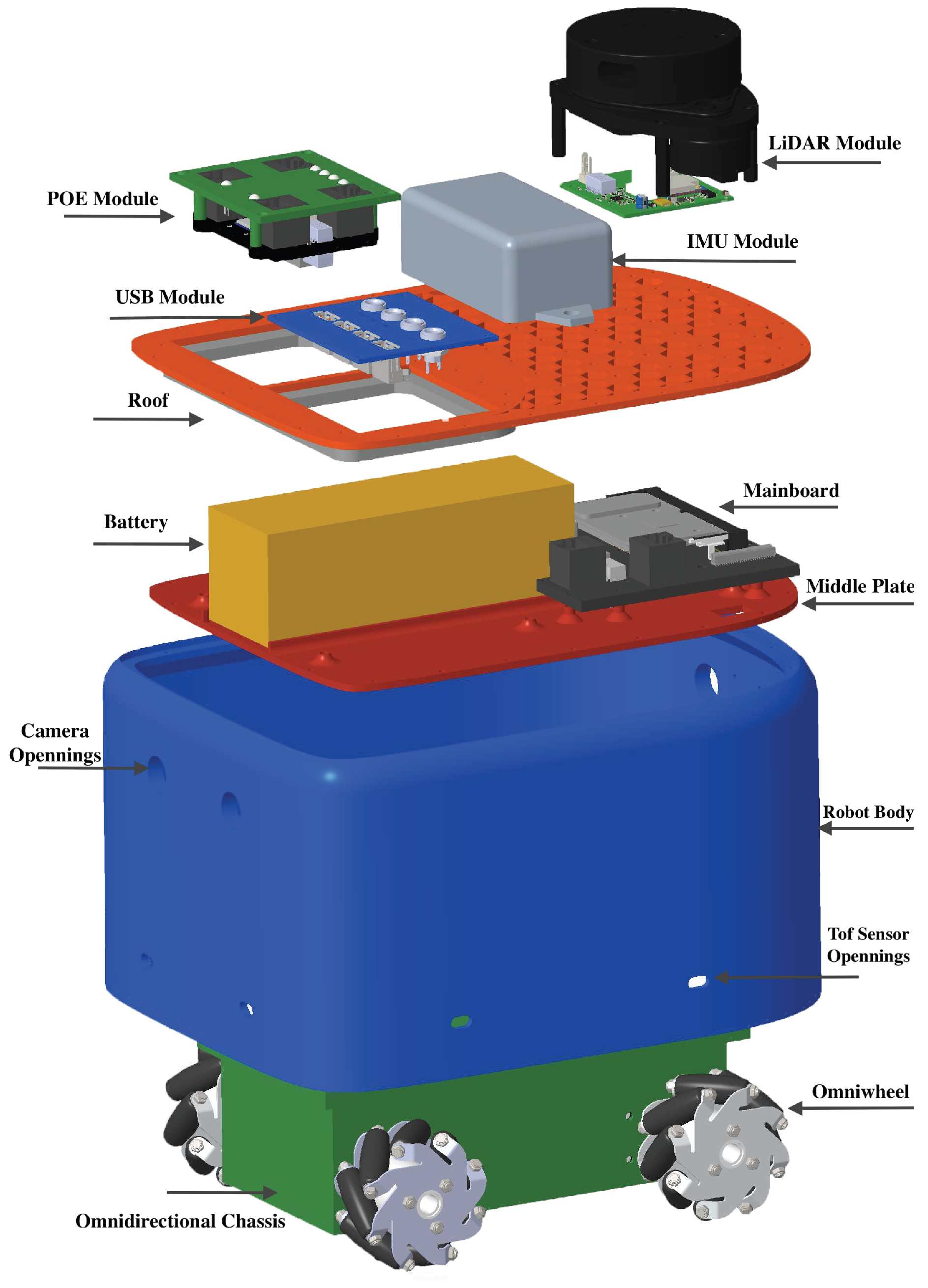 At the physical level, the robot integrates a range of sensing (stereo cameras, LiDAR, IMU, ToF sensors) and actuation systems (omnidirectional wheels), interconnected through a heterogeneous but structured communication framework using Ethernet, POE, I2C, and CSI interfaces. On the computational side, embedded systems such as the Jetson Nano and ESP32 microcontrollers manage perception, control, and data coordination across the layers. The ROS2 framework orchestrates these processes in a distributed fashion, supporting run-time visualisation, manual operation, and autonomous behaviour.