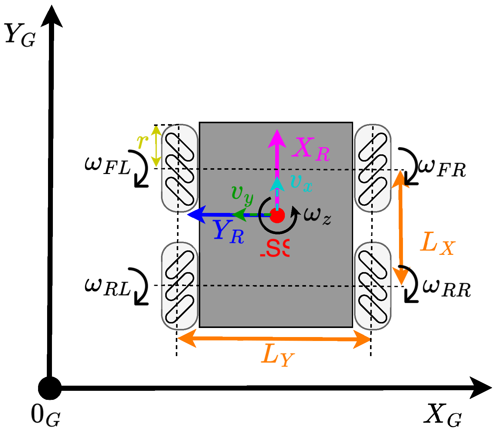MapBot platform an additional upper layer must be implemented. This layer is responsible for translating the desired motion of the robot into individual motor commands, and vice versa. Specifically, it requires converting the robot’s global velocity commands into its local frame of reference. The transformation equations used for this conversion are given by:
