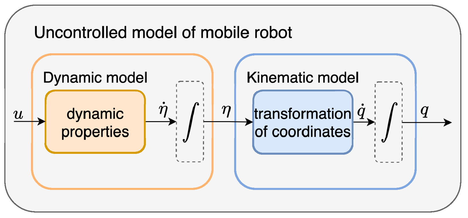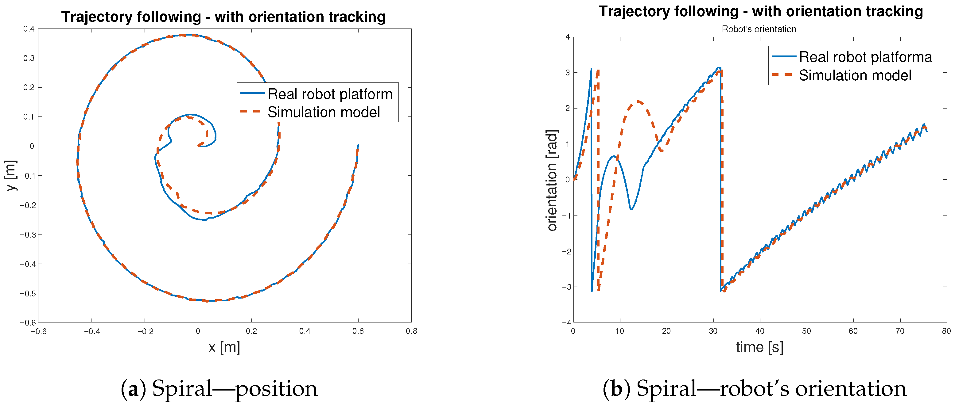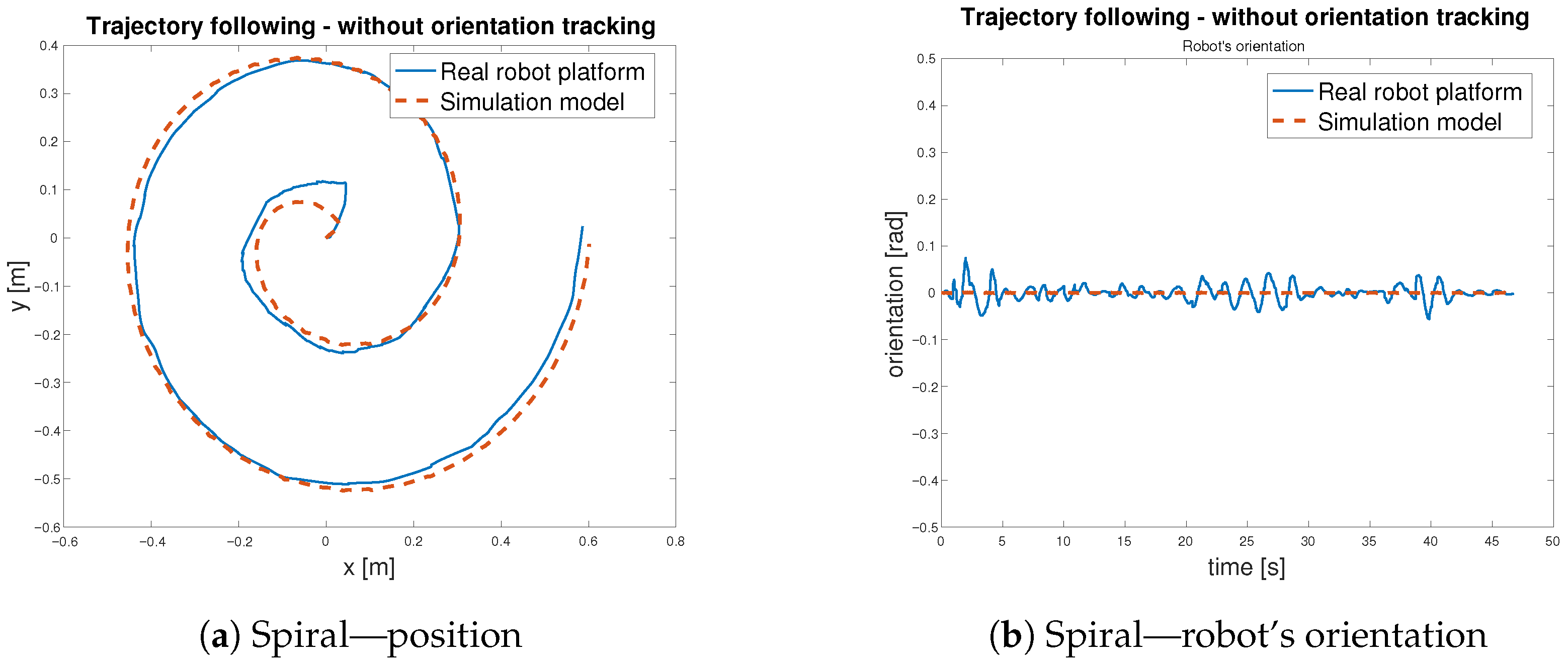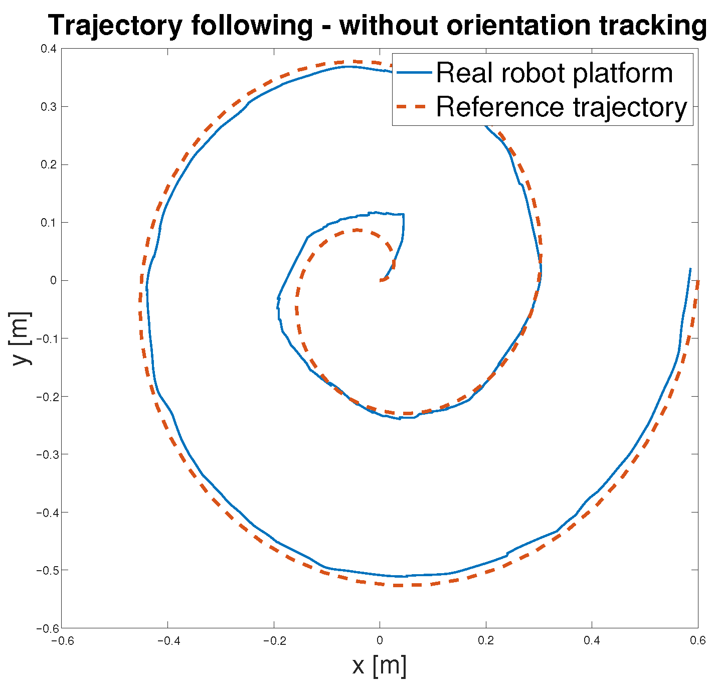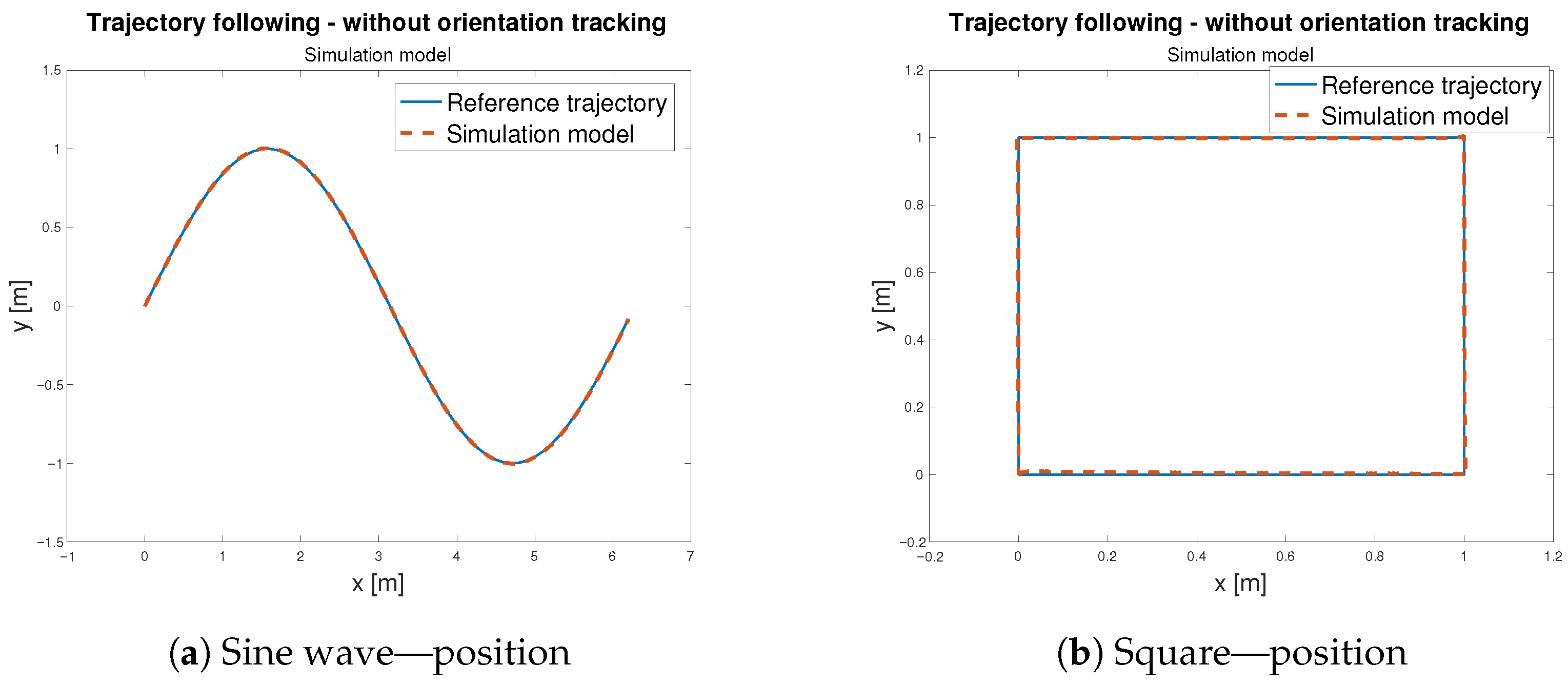 When calculating the velocity while tracking the robot’s orientation change, we assume that and that the robot will follow the trajectory and its orientation as if it were a differential drive. For calculating the velocity without tracking the robot’s orientation change, it is considered , which means that the trajectory following is dependent only on lateral velocities . This mode of trajectory following is useful mainly for tasks where the robot’s orientation has to be fixed—for example, when the camera is tracking the object in motion while the robot is following the referenced trajectory. In such a case, need a separate controller based on the expected behaviour.