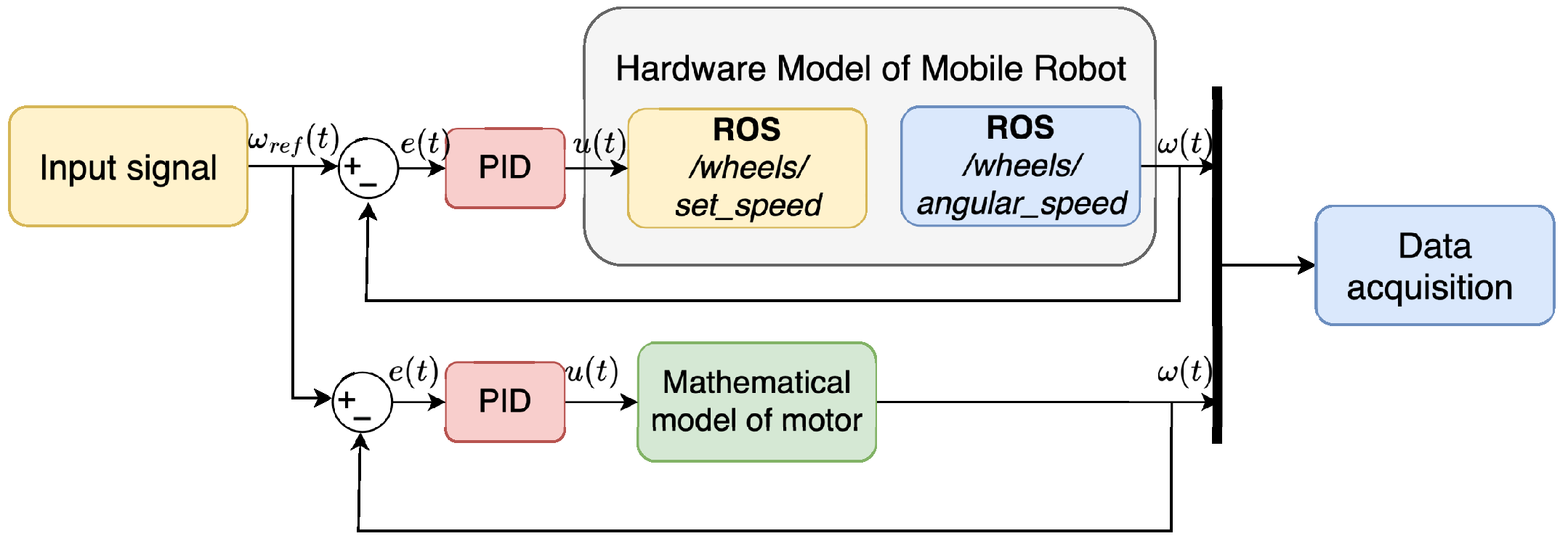 As the ARMAX models of the DC motors were already validated, they were subsequently used to design speed controllers for each motor. A discrete PID control strategy was selected, and each motor was assigned a dedicated controller tuned according to the parameters of its corresponding ARMAX model. The behaviour of the controllers was first verified within a simulation environment. Following this, various operational scenarios were tested. Due to established ROS-based communication between the simulation and the physical MapBot platform, the control loop, including all computations, was executed in Simulink. Control signals were transmitted to the robot, while real-time velocity feedback was received from the motors. After confirming the correct functionality through this setup, the PID controllers were also implemented directly on the MapBot platform. The developed application library supports both control approaches, allowing users to select between simulation-based or on-board execution.