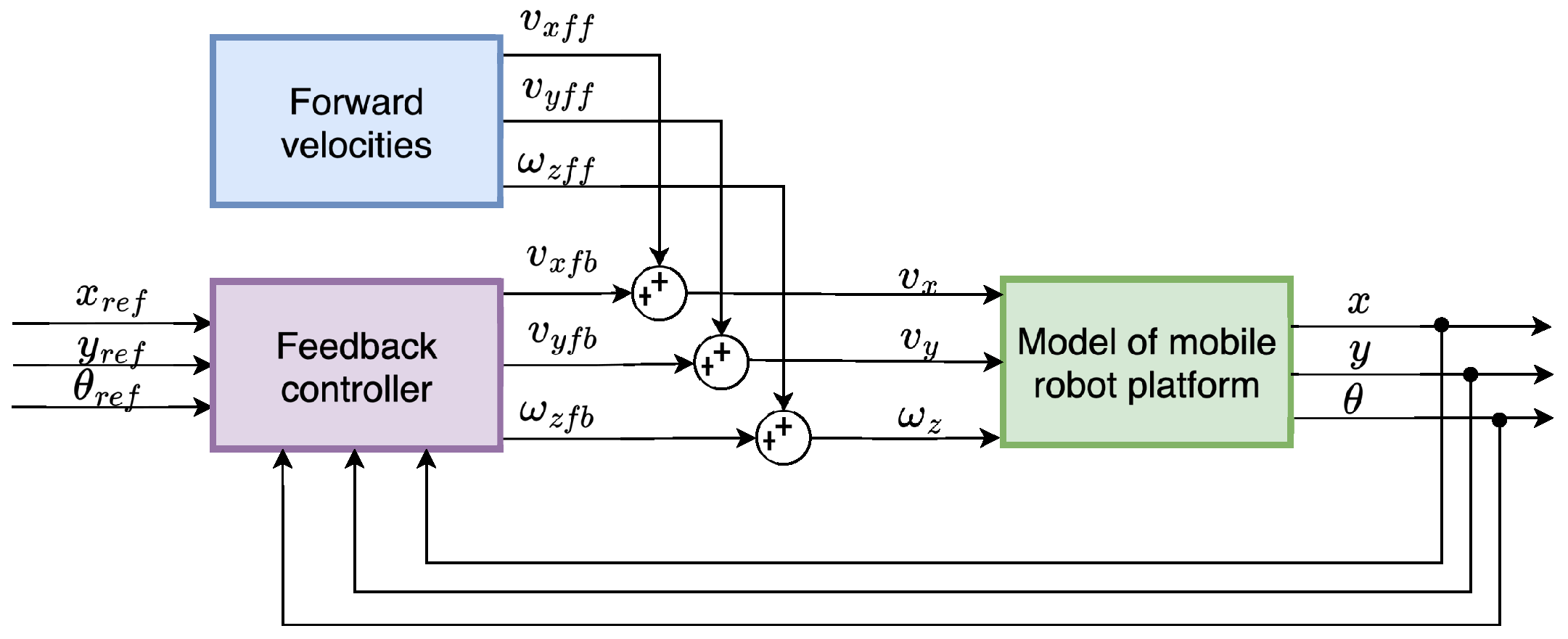 The feed-forward velocities are determined from the reference trajectory. For an omnidirectional robot, these velocities can be computed in two distinct modes: either by following the trajectory while also tracking the robot’s orientation, or by following the trajectory without considering orientation tracking.