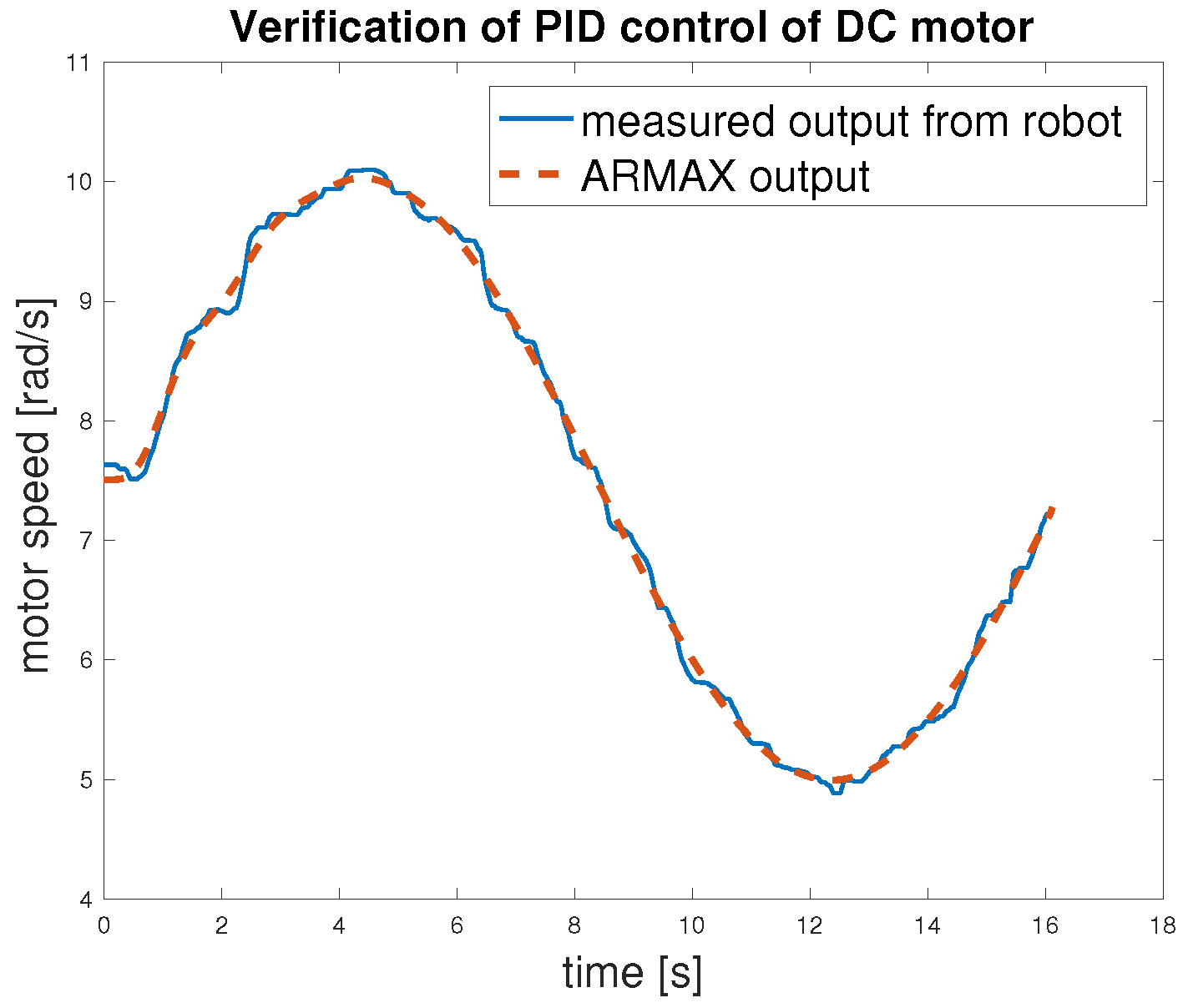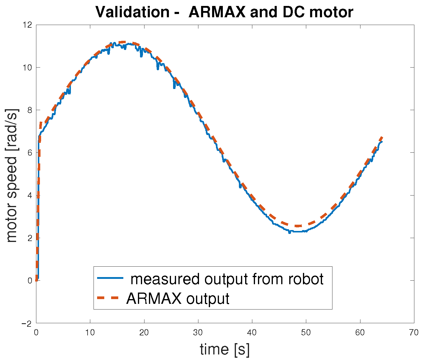 Figure 12. The input signal was changed from a pseudorandom binary sequence to a sine wave, which effectively covers the motor’s operational range. The validation procedure was applied as follows: the sine wave input was delivered simultaneously to both the ARMAX model and the actual DC motor within the