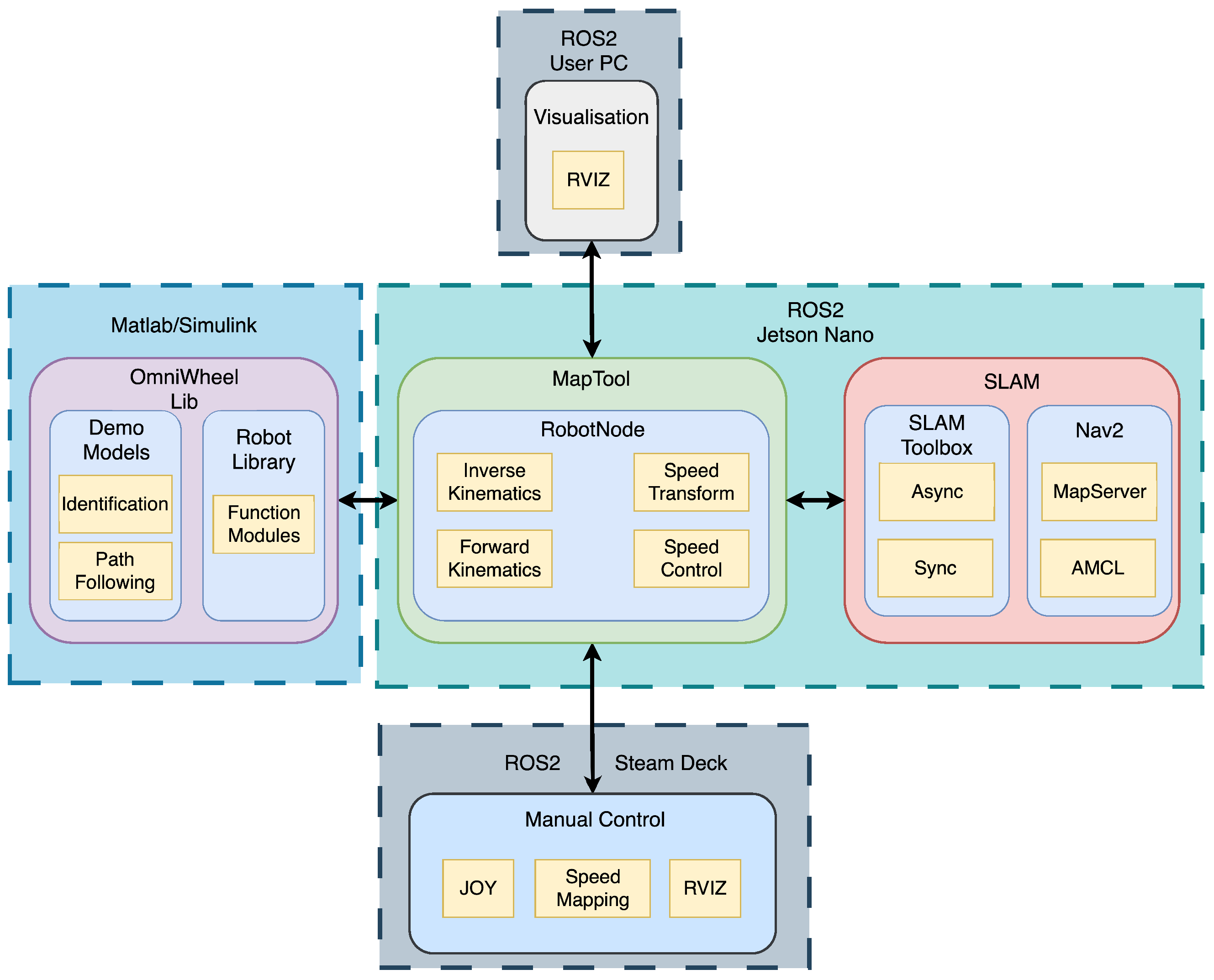Figure 24). The application is built using the ROS framework and is executed within a Docker container based on the ROS 2 Humble image. This design choice ensures high portability, enabling the system to be easily migrated to different hardware platforms or operated remotely on external servers. It runs on an embedded Jetson Nano computer inside the robot, enabling on-board processing with low latency and avoiding the instability of wireless links. A SteamDeck gamepad controller provides teleoperation and live visualisation of the generated map. The system supports alternative game controllers compatible with the ROS2 Joy library, which allows flexible user interaction.