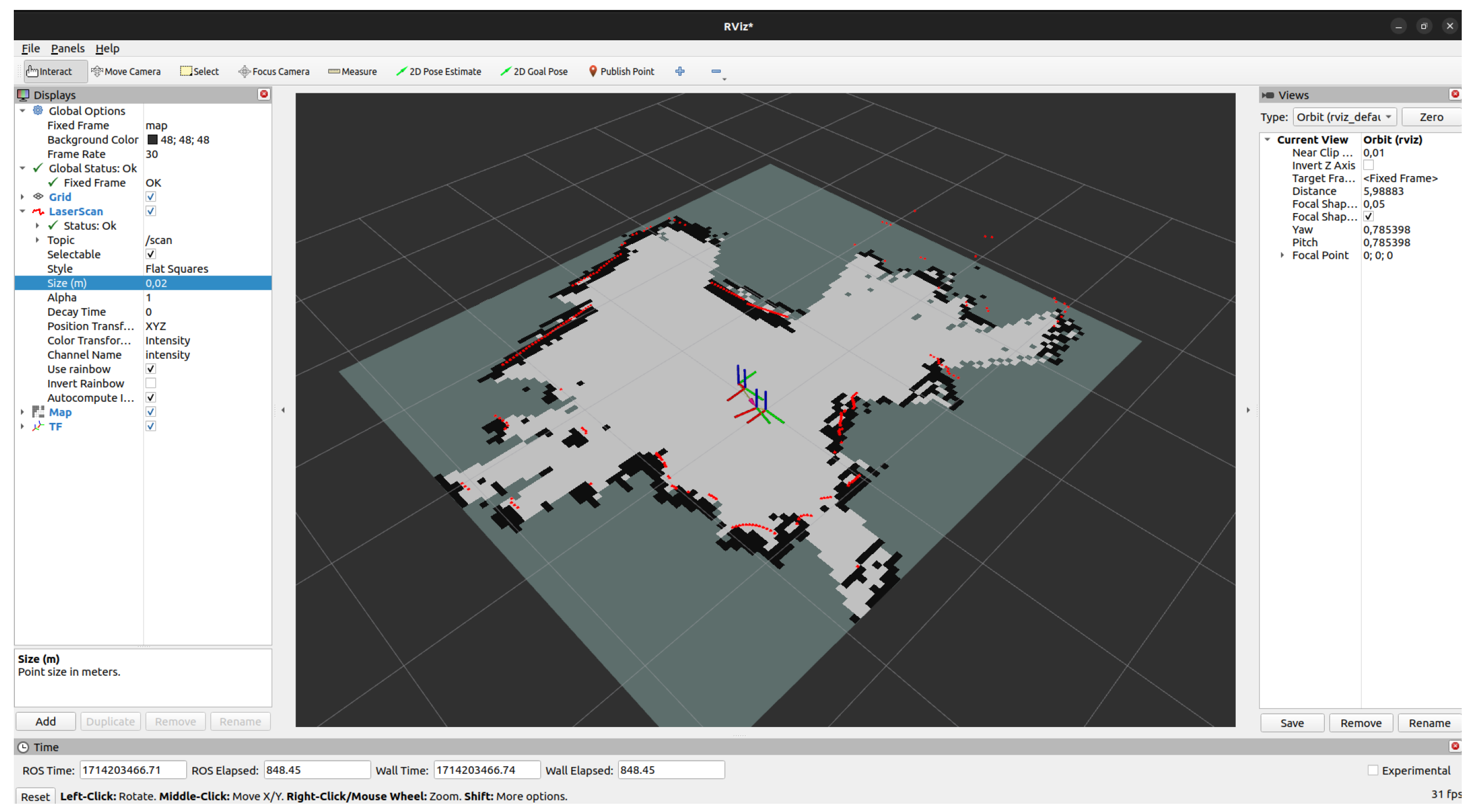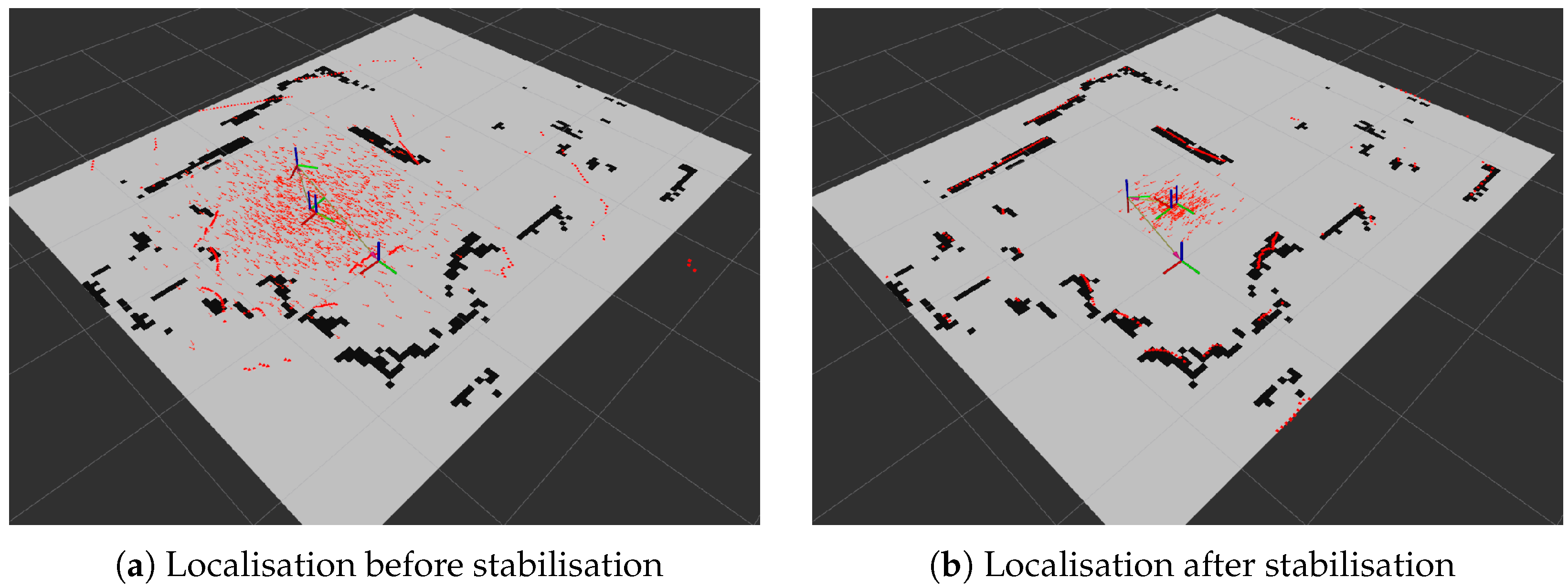 Figure 27 depend strongly on the characteristics of the LIDAR sensor. In this study, an RPLidar (Slamtec) was used, which has a maximum range of approximately 6 to 12 m and operates with relatively low laser power compared to industrial grade sensors. These limitations primarily affect measurement quality: sensor performance degrades on low-reflectivity surfaces and exhibits increased noise at the far end of its range. Regardless of the sensor, the structure of the environment also plays a key role. Environments with rich and well-distributed features within the effective sensing range enable the AMCL particle filter to converge quickly, whereas sparse or large open areas provide fewer constraints for localisation, which can slow down stabilisation or increase uncertainty. Thus, while the results demonstrate successful localisation, they should be interpreted with awareness of both the limitations of the sensor and the environmental conditions under which it operates.
