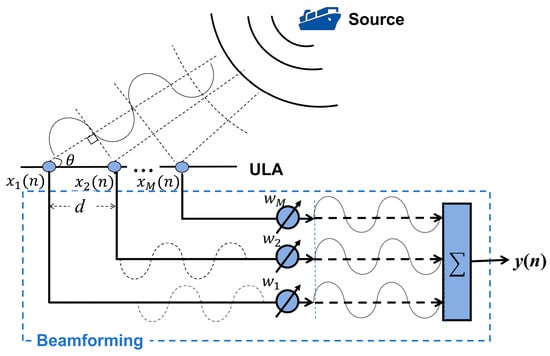 As shown in Figure 1, acoustic waves radiated from far-field targets propagate as plane waves to an M-element Uniform Linear Array (ULA) with element spacing d, incident angle θ, frequency f, and sound speed v. The time delay and phase shift of the m-th element relative to the reference element are