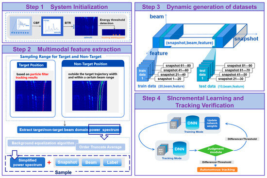 This study proposes a neural network-based bearing-only multi-target tracking algorithm for passive sonar, applying neural networks to detection sonar signal tracking. To address the challenge of scarce training data in practical applications, the algorithm employs an on-site learning mechanism combined with particle filter tracker to obtain initial training data. The overall architecture is shown in Figure 2; the specific implementation involves the following key steps: