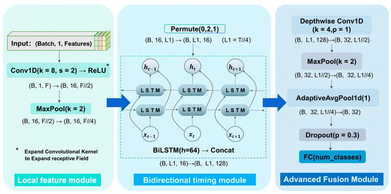 Introduces BiLSTM units (hidden_size = 64) to establish cross-timestep feature correlations via gating mechanisms. A dimension permutation operator (Permute) is specifically designed to adapt the CNN feature map format into a sequence vector format, enabling the bidirectional network to fuse both forward and backward propagation context information. Output dimension: (batch_size, L1, 128), where the 128-dimensional feature vector contains concatenated bidirectional hidden states.