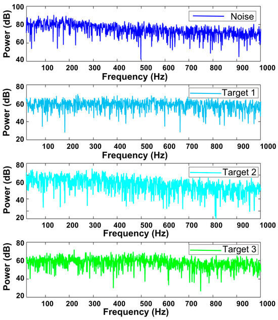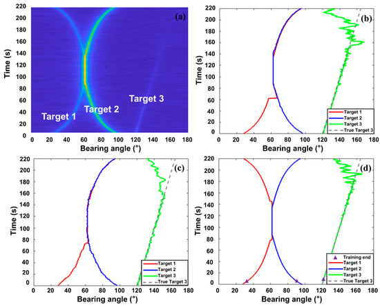 In the simulation, three moving targets were defined over an observation time T of 220 s. Target 1 starts at 27°, and Target 2 starts at 97°. These targets move towards each other, their trajectories overlapping starting at 80 s and separating after 60 s. This X-shaped trajectory is a primary cause of mis-tracking in multi-target scenarios. Target 3 moved from 120° to 165°, while its energy decayed at a constant rate , testing the tracking method’s performance under extremely low SNR. The background noise and target signal characteristics are listed in Table 2; their power spectra are shown in Figure 4. The array sampling frequency is 5000 Hz. Each frame uses 1.6 s of data with 80% overlap between consecutive frames. FFT length is . Conventional beamforming was performed within the 20 Hz to 1000 Hz band; the resulting BTR is shown in Figure 5a.