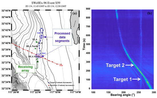 Experimental data originates from the South Horizontal Line Array (HLAS) data collected during the SwellEx-96 sea trial. The S59 event, containing strong interference sources, was selected for validation. This event is particularly suitable for studying algorithm performance in locating quiet targets amidst strong interference. Target 1 (source ship) started between two horizontal arrays, moving slightly east initially, then proceeded roughly north along the 180 m isobath at 5 knots (≈2.5 m/s). In the last 25 min, the tow ship headed towards port and completed a loop. Target 2 (interferer) started west of all arrays, moved southeast, and ended east of the arrays. Figure 6a shows the target trajectories. A segment containing a trajectory crossing was selected to rigorously validate the proposed method’s performance under multi-target crossing and low SNR conditions. HLAS sampling frequency was 3276 Hz. FFT length was 2048. Frame duration was 0.625 s. Conventional beamforming was applied within the 20 Hz–1000 Hz band over 0°–360°. The BTR in Figure 6b further reveals the complexity: Target 1 itself is weak and severely affected by environmental noise between 100 s and 500 s, coinciding with the crossing of the strong interferer’s trajectory. Signal 2′s energy weakens after 500 s, exhibiting trajectory fragmentation around 700 s.