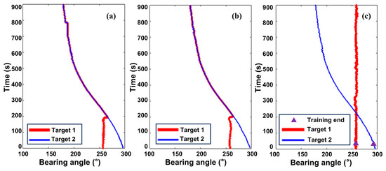 The advantages of this method lie in its ability to handle nonlinear problems and explicitly model target motion through a state-space model. Therefore, when observations are temporarily missing (e.g., due to low SNR) but the trajectory remains continuous, motion model predictions maintain tracking continuity. However, the particle filter tracker also has limitations in trajectory crossing scenarios. When multiple target trajectories cross in bearing, particles tend to cluster towards the target with higher energy. After crossing and separation, the particle swarm may fail to correctly “split” back to their respective target trajectories, leading to mis-tracking.