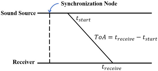 Among them, ranging-based positioning frameworks are more prevalent. The ToA positioning framework offers high accuracy and stability but demands high-precision time synchronization among nodes. Although the TDoA positioning framework eliminates the need for time synchronization between tags and base stations, it requires a larger number of beacon base stations, resulting in higher costs and inferior positioning accuracy and stability compared to the ToA framework. Therefore, when facing multipath effects and occlusion in complex indoor environments, the ToA positioning framework has a distinct advantage. However, indoor sound systems based on the ToA positioning framework broadcast measurement signals through base stations and smart mobile terminals, leading to higher power consumption at the signal broadcasting end and potentially exposing device privacy. Considering power consumption and privacy security concerns, the passive ToA-based positioning framework is typically adopted. In this framework, base stations serve as the broadcast signal sources, and mobile intelligent terminals passively receive signals to obtain the ToA values of audio signals. The passive ToA-based positioning method is illustrated in Figure 1.