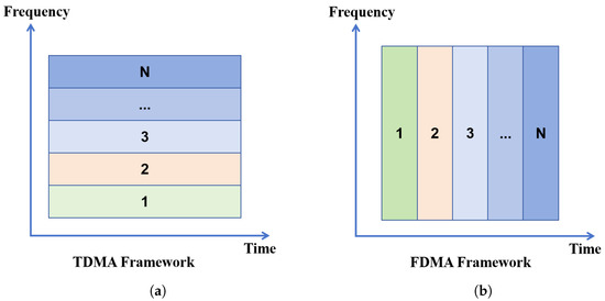 (a) TDMA and (b) FDMA signal transmission frameworks.