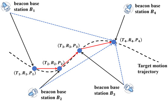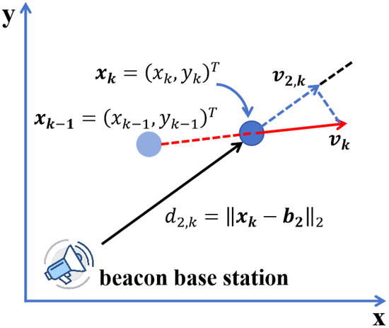 Assume there are N beacon base stations (with known absolute coordinates) deployed within the indoor environment. At the k-th time slot, the target node located at position receives an acoustic signal transmitted by beacon . The distance between the target and the transmitting beacon is denoted as . This distance can be inferred based on the time of arrival (ToA) of the acoustic signals under the asynchronous TDMA scheme. The overall localization process under this framework is illustrated in Figure 3.