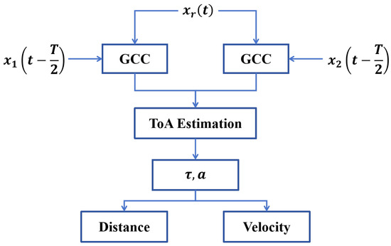 The received signal at the moving target is denoted . To estimate the time delay of arrival and the Doppler-induced frequency shift, a dual-stage Generalized Cross-Correlation (GCC) is performed using and as reference signals. Let denote the GCC output. A fixed-threshold peak detection approach is applied to estimate the time delay of each signal component: