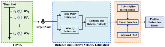 where and are weighting coefficients that control the trade-off between observation fidelity and trajectory regularity. Specifically, emphasizes fitting the raw measurements, while enforces smoothness in the estimated trajectory. The resulting formulation enables the integration of both geometric and dynamic information into a unified optimization framework, which supports robust and accurate trajectory recovery for moving targets in asynchronous TDMA-based indoor localization systems. The overall technical framework is shown in Figure 6.
