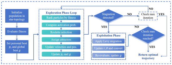 Through this multi-level particle role assignment and the introduction of Levy-based perturbation under stagnation, the proposed method maintains a balance between convergence accuracy and global adaptability during the exploitation phase, ultimately improving the algorithm’s robustness and optimization effectiveness. The overall structure of our proposed PSO algorithm is shown in Figure 8, and the detailed algorithm is demonstrated in Algorithm 1.