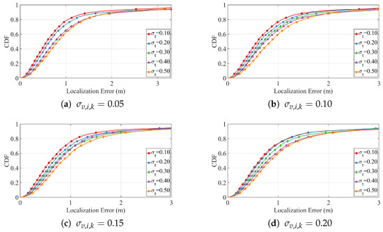 We first assess the impact of different timing noise levels by fixing the velocity noise at , and varying the ToA noise . For all simulations in this group, the target motion speed is fixed at . The corresponding localization results are shown in Figure 9a–d. In each subfigure, the empirical cumulative distribution functions (CDFs) reveal that the majority of localization errors remain within a small range, even as noise levels increase. Although higher values cause a modest rightward shift and flattening of the CDF curves, the degradation is gradual, demonstrating strong resilience to timing noise.