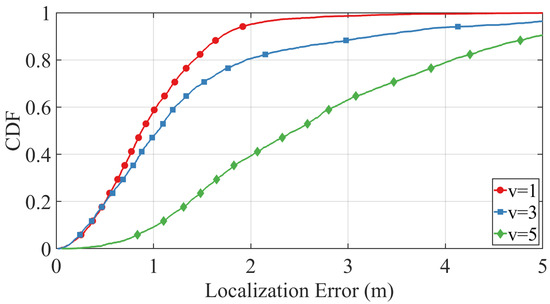 Empirical CDFs of localization errors under different target motion speeds , with adverse noise levels and . The results demonstrate the proposed method’s robustness to velocity variations.