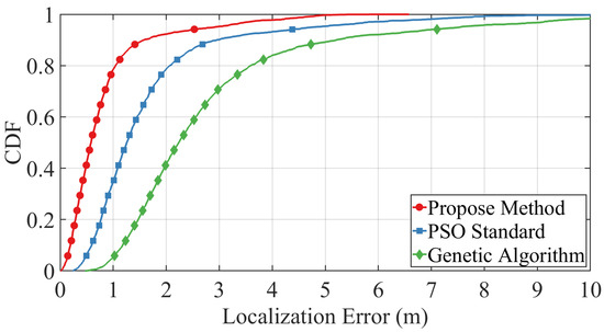 The cumulative distribution function (CDF) of localization errors under these conditions is presented in Figure 11. As shown, the proposed method (red curve) significantly outperforms both the standard PSO (blue curve) and GA (green curve), achieving lower localization error with higher consistency. Specifically, our method achieves a steeper CDF rise and reaches near-complete convergence within 3 m, while the other baselines exhibit slower convergence and wider error dispersion. These results demonstrate the superiority of our method in achieving accurate and robust localization in noisy environments.