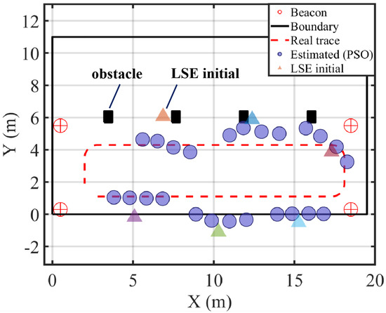 Real-world experimental layout and localization results. Red circled-plus markers denote beacons (anchors); the black rectangle indicates the boundary; black squares are obstacles. The red dashed curve shows the ground-truth trajectory. Blue filled circles are the positions estimated by the proposed PSO-based method. Colored triangles denote the initial positions produced by the direct least-squares estimation (LSE), with colors indicating different initializations. Axes are in meters.