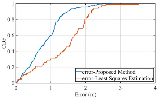 To quantitatively compare the localization performance, Figure 13 presents the empirical cumulative distribution functions (CDFs) of localization error obtained from the real measurement data. The solid blue curve corresponds to the proposed method, while the orange dashed curve represents the baseline approach that applies direct least squares estimation (LSE) without any temporal modeling or optimization.