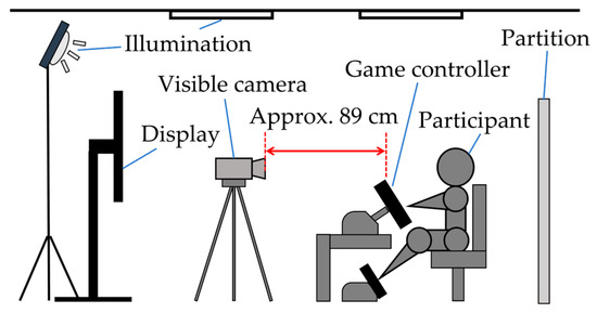 A flowchart of the data acquisition experiment is presented in Figure 2. First, the participants were asked to complete a questionnaire regarding their psychological and physical conditions before and after the experiment to understand their health status. The participants were then asked to play a game three times per session. The game was filmed from the front of the participant via a visible camera (Panasonic Holdings Corporation, Osaka, Japan, 4K video camera HC-VX2M) [45] before and after the gameplay (1920 × 1080 pixels, 1280 × 720 pixels for certain data, 30 fps for each). After playing the game, the participants were asked to watch a recorded video of themselves playing the game and the game screen. While viewing the footage, they identified the time segments (time within the video footage) in which emotions occurred, specified the type of emotion, and rated its intensity (emotional arousal intervals questionnaire). The type of emotion was reported based on the participants’ candid impressions. Intensity was rated on a three-point scale (strong, medium, weak). First, the participants classified each expressed emotion as either “strong” or “weak”; emotions that did not fall into either category were classified as “medium.” An example of the emotional arousal intervals (EAI) questionnaire is listed in Table 2. To avoid playing for a long period and eliminate the influence of the previous gameplay, break and rest times of 5 min each were set after each gameplay. The experiment was conducted using general fluorescent lighting and lighting equipment (NEP Inc., Tokyo, Japan, VARIABLE-29-SET) [46]. The illumination during the experiment was as follows: