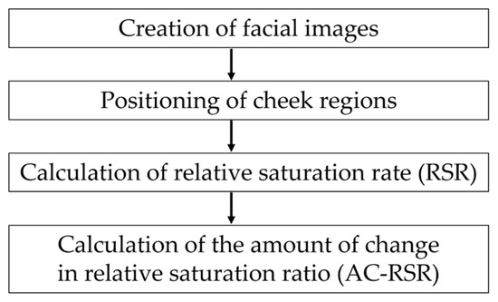 In this study, we focused on how the saturation of the cheek region changed compared with the saturation of the entire face calculated via the L*a*b* color system [47]. The cheek region was selected as the target for analysis because it is one of the facial areas with a high density of blood vessels, and it is easier to capture than the forehead, which may be obscured by hair depending on the participant, or the nose, which is prone to shadows owing to its contours. The procedure for the proposed method is illustrated in Figure 3. First, the captured video image is divided into still images, and a facial image is created by detecting the position of the face in the resulting image. The position of the cheek region is subsequently determined from the facial image. An indicator is calculated through comparisons of the relative saturation of the set cheek region with that of the entire facial region (RSR). Finally, the change in the relative saturation ratio (AC-RSR) is calculated.