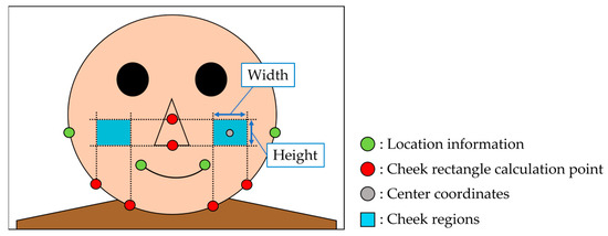 The positions of the cheek regions were determined based on the position information of the nose and contours obtained in Section 3.1. The results of facial position information extraction are shown in Figure 4. First, the width of the cheek region was calculated based on the points on the contour shown in red in Figure 4. The height of the cheek region was subsequently calculated from the points on the nose, as shown in red in Figure 4. Consequently, a rectangle was generated from the calculated height and width, and its center coordinates were calculated as a temporary cheek region. This process was performed on all the facial images. The average heights and widths of the temporary cheek area for the entire experimental dataset (three races) were subsequently calculated. The calculated values were used to determine the height and width of the cheek region in each experiment. Finally, the cheek region positions were determined from all the facial images via the determined cheek area sizes and center coordinates. An image of the cheek region is shown in Figure 4. The position of the cheek area was adjusted to ensure that shadows caused by lines did not affect the cheek region.