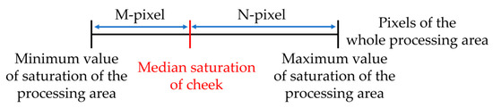 First, we specified the region where the saturation was extracted (processing region) to remove the background region contained in the facial image. Figure 5 shows an example of how the processing area was specified. Furthermore, an example of a participant’s image after performing the saturation extraction process is presented in Figure 6. If a participant wore eyeglasses, this could affect the saturation. Thus, for participants wearing eyeglasses, as shown in Figure 5b, the area around the glasses was adjusted such that it was excluded from the processing area. Next, the saturation of each pixel in the entire processing area of the facial image was sorted in ascending order. Furthermore, as shown in Figure 7, the numbers of pixels M and N were calculated when the “pixels of the entire processing area” were divided into two parts based on the “median saturation of the cheek area.” The RSR in the cheek area was calculated (for the left and right cheeks) using Equation (1). This process was applied to all facial images to calculate the RSR during gameplay. Figure 8 shows an example of the calculated RSR. The vertical axis in Figure 8 represents the RSR, whereas the horizontal axis indicates the corresponding video frames, which are converted from time (e.g., 1800 frames = 60 s = 1 min). In Equation (1), M and N indicate the number of pixels below and above the median, respectively.