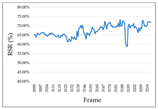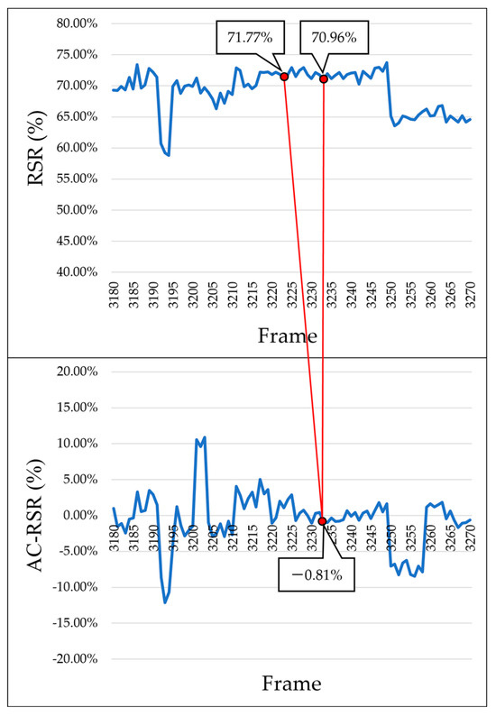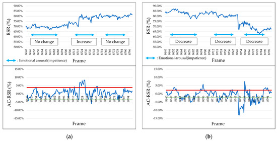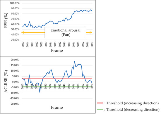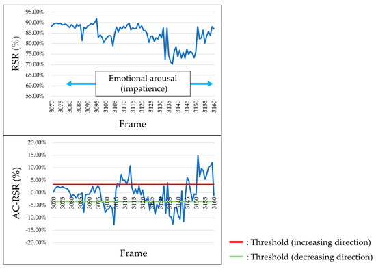 The AC-RSR was calculated to clarify the change in the calculated RSR time and the direction (increase or decrease) of change. Figure 9 shows an example of the calculated results. In Figure 9, the vertical axes represent the RSR and the AC-RSR, respectively, whereas the horizontal axis indicates the video frames, as in Figure 7. First, the frame of interest (FOI) was determined from the facial images in the video. The difference between the RSR of the FOI frame and the nine frames before the FOI frame was subsequently calculated as the amount of change. The choice of a 9-frame interval is based on a previous study [50], which suggests that there is an approximately 0.2 s time lag between the occurrence of an emotion and the point at which changes appear in the information obtained from the facial surface.
