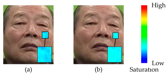Previous studies [42] have demonstrated that changes in blood flow in facial skin occur in association with emotional responses (e.g., a decrease in cheek temperature caused by blood flow changes was observed as a result of being surprised [51]). Accordingly, the fluctuations in RSR observed in the present study indicate an increase or decrease in facial redness in the cheek region due to changes in blood flow. The fact that such fluctuations were detected within the analysis intervals suggests that the RSR may serve as a potential feature for determining whether an emotion has been elicited in a participant. Figure 10 presents the saturation images of the cheek region before and after an event that triggered an emotional response. In this example, the images were captured before and after overtaking multiple other vehicles, and the participant self-reported the emotion of “joy” after overtaking. A comparison of the images before and after the event reveals an overall increase in cheek saturation following the event, implying that blood flow changes associated with emotion elicitation occurred.