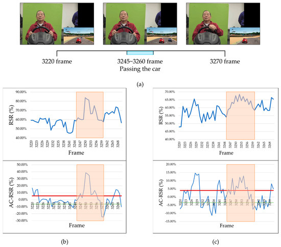 Figure 14 presents an example of facial images from Participant A during an emotion-eliciting interval, along with the calculated RSR and AC-RSR for the left and right cheek regions. This interval corresponds to a moment in which the participant successfully overtook a competitor’s car and self-reported the emotion of “joy.” As shown in Figure 14b,c, an increase in the RSR at the time of overtaking was detected using the proposed method. As discussed in Section 4.2, RSR tends to increase during the elicitation of positive emotions; therefore, the observed saturation change in this interval is consistent with the participant’s self-reported emotion of “joy.” In contrast, the RMN model’s output for the same interval classified all 51 frames, from frame 3220 to frame 3270, as “neutral.” As can be seen from the sample images in Figure 14a, the participant’s facial expression showed minimal change immediately before and after overtaking the competitor’s car. This likely explains why the RMN model output was “neutral.”