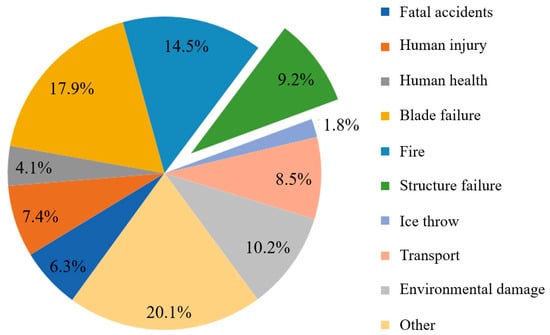 2]. Wind turbine bolts are crucial fasteners in wind turbines; they ensure reliable connections between the various parts of the structure. Cracks, loose internal defects, and other problems occurring due to the large axial preload, will directly affect the structural stability of the tower, leading to the deformation or displacement of the tower when it is subjected to a high wind load, which will not only cause substantial economic losses but could also threaten the lives and safety of nearby personnel. Over a period of four decades up to 31 December 2016, a total of 1999 wind farm accidents occurred. Structural failures, including tower collapse and turbine damage, accounted for 9.2% of the total accidents (as shown in