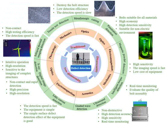 1]. Defects produced in the manufacturing process include quenching cracks and internal inclusions, but bolt defects, including fatigue cracks, stress corrosion cracks, thread wear, hydrogen delayed fracture inclusions, porosity, etc., are more often caused by harsh environments. These defects are a potential threat to the safe operation of the turbine and must be inspected regularly. However, traditional bolt detection methods, such as disassembling the high-strength bolts of the wind turbine tower for destructive metallographic analysis, cannot meet the needs of modern wind turbines with long-term operation. Non-destructive testing technologies, such as ultrasonic detection rays, electromagnetic detection, etc., can perform the real-time monitoring and online diagnosis of bolt defects. Non-destructive testing technologies are not only applied in bolt defect detection, but also in manufacturing; to detect defects such as porosity, inclusions, and cracks in recently parts, they are also used in the aerospace industry to screen for defects in the aircraft fuselage, wing engine, and other key parts of the airplane, as well as in the petrochemical industry, the electric power industry, and other fields. Hence, it is clear that non-destructive testing technology represents a major step forward in the field of defect detection.