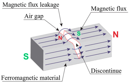 7]. It is widely used in the detection of surface and near-surface defects of ferromagnetic components in vehicle engineering, heavy aerospace industry, and other industries based on the that when a strong magnetic field is applied to the surface of a ferromagnetic material or component, the geometrical discontinuity of the surface of the object under inspection will cause the applied magnetic field to leak out from the discontinuity, forming a magnetic leakage or a distortion of the magnetic lines of force, as shown in