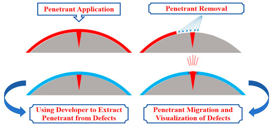 Figure 7. The basic principle is that PT is carried out by adding a low-viscosity penetrant (dye or fluorescent liquid) to the surface of the component to be tested such that the low-surface-tension fluid penetrates the geometrical discontinuities or defects on the surface of the object via capillary action [