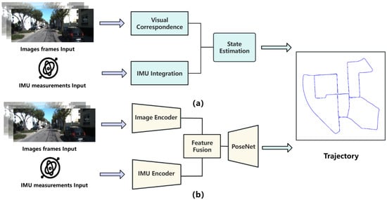 VIO methods can be broadly categorized into two types: geometry-based approaches and learning-based approaches. As shown in Figure 1a, geometry-based methods typically consist of visual correspondence, IMU integration, and state estimation. State estimation, in turn, can be divided into two subcategories: optimization-based and filtering-based methods. Geometry-based approaches [,,] generally achieve high accuracy under controlled or favorable conditions. However, these methods rely heavily on manually designed feature extraction and non-linear optimization techniques, making them highly sensitive to the quality of visual features and the accuracy of initialization. Furthermore, the reliance on manual feature extraction and nonlinear optimization leads to high computational complexity, limiting real-time applicability. In recent years, learning-based VIO models [,,] have shown robustness in complex scenarios by automatically extracting visual and inertial features end-to-end. The general architecture of these methods is shown in Figure 1b, mainly consisting of a visual–inertial encoder, a feature fusion network, and a pose regression network. However, these methods often rely on recurrent neural networks (RNNs), such as Long Short-Term Memory (LSTM) [] and Gated Recurrent Unit (GRU) [], for temporal modeling. These models suffer from gradient vanishing problems [], especially as the sequence length increases. They also struggle to capture long-term dependencies, which reduces accuracy. In addition, their sequential processing prevents parallel computation [], leading to slower training and inference and limiting scalability.