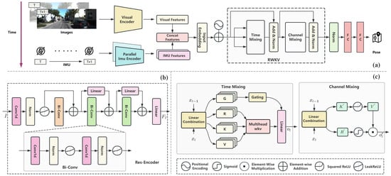 We propose an in-depth description of the proposed deep learning-based VIO model. As illustrated in Figure 2a, the framework consists of a visual encoder, Res-Encoder, parallel encoder strategy, a positional encoding module, and a decoder built upon the RWKV network architecture. Each component is crafted to handle the specific challenges associated with visual–inertial fusion. This allows for effective feature extraction, reliable temporal modeling, and accurate pose estimation.