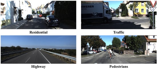 - Geiger, A.; Lenz, P.; Urtasun, R. Are we ready for autonomous driving? The KITTI vision benchmark suite. In Proceedings of the 2012 IEEE Conference on Computer Vision and Pattern Recognition, Providence, RI, USA, 16–21 June 2012; pp. 3354–3361. [Google Scholar] [CrossRef]