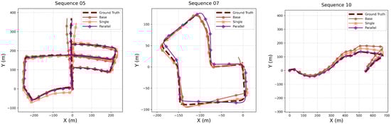 Ablation experiments were conducted to evaluate the effectiveness of the proposed inertial encoder in reducing the trajectory drift and cumulative errors. These experiments were performed in consistent settings, with modifications applied only to the inertial encoder. Specifically, three configurations were tested: a baseline encoder consisting of three convolutional layers, a single Res-Encoder, and the proposed parallel encoder strategy. The baseline encoder processes six-channel IMU data through three sequential 1D convolutional layers with channel dimensions increasing from 6 to 64, 128, and 256 respectively, each followed by BatchNorm, LeakyReLU (negative slope 0.1), and Dropout, before projecting features to the target dimension via a fully connected layer. As illustrated in Figure 4, the parallel encoder strategy significantly improved performance. The trajectory in Sequence 10 exhibited marked convergence, while the trajectory in Sequence 05, particularly near the end, aligned more closely with the ground truth (GT) compared to both the baseline encoder and the single Res-Encoder.
