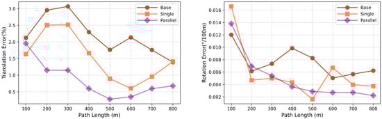 To validate the drift suppression efficacy of the proposed strategy, we evaluated average translation and rotation errors across distances on KITTI Sequence 05. As shown in Figure 5, the baseline encoder lacks residual connections and loses critical historical IMU features, resulting in notable error accumulation over distance and abrupt initial translation errors. The single Res-Encoder preserves partial shallow features via residuals yet shows distinct initial translation fluctuations and cumulative error trends. In contrast, the parallel strategy uses dual independent Res-Encoders for complementary IMU feature extraction, effectively reducing error accumulation, enhancing curve stability, and suppressing initial translation abruptness, which demonstrates that residual connections and parallel structures collectively enable robust suppression of IMU error accumulation.