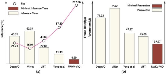 As shown in Figure 6a, we compared the inference time and frame rates of various models. RWKV-VIO achieves the best performance, with an inference time of only 4.59 ms and a frame rate of 217.86 fps, significantly outperforming DeepVO (46.81 ms, 21.73 fps), VINet (16.04 ms, 62.34 fps), VIFT (22.80 ms, 43.86 fps) and Yang et al.’s method (11.39 ms, 87.80 fps). In Figure 6b, RWKV-VIO has a parameter size of only 37.97 M, much smaller than DeepVO (71.23 M), VIFT (45 M), VINet (47.97 M) and the Yang et al. [] method (85.65 M). This shows that RWKV-VIO excels both in inference efficiency and in terms of the lightweight design of the model.