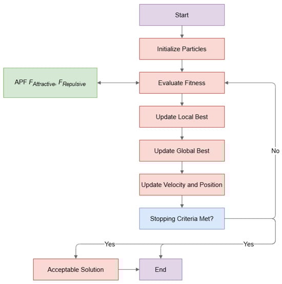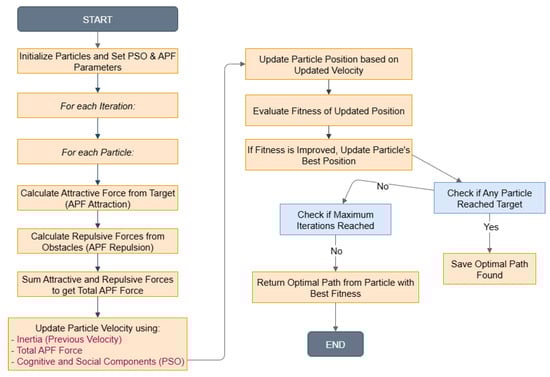 - At each PSO iteration: The APF module provides feedback by modifying the velocity vector of each particle to account for dynamic obstacles. This refined trajectory is then evaluated by the PSO fitness function, integrating local obstacle avoidance into the global optimization process.