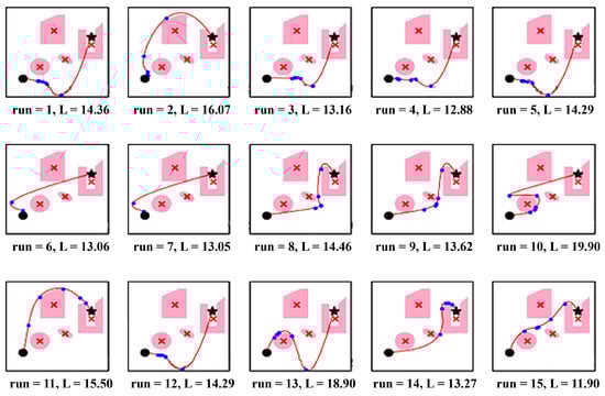 For each particle, calculate the fitness function of its path by determining the length from the starting point to the endpoint and evaluate the quality of each particle’s position, with for obstacle avoidance. Mathematically, it can be expressed as: