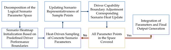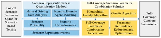 Scenario-based testing has gradually become the mainstream approach for evaluating the performance of automated driving systems (ADS) [,,]. In this framework, logical scenarios are described using parameter spaces, forming the foundation of scenario library construction and serving as key references for third-party testing organizations in defining test boundaries [,]. However, during the performance validation of different systems, testing organizations are required to establish standardized and regulated concrete scenario libraries to enable comprehensive evaluation of the logical scenario parameter space []. The generation of such concrete scenarios must ensure both consistency and coverage, which has become a major obstacle for third-party testing practices.