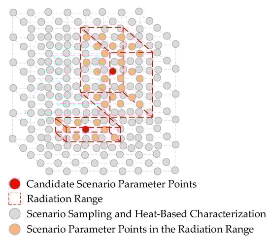 During each iteration of the greedy selection process, based on the current heat value hk(xi), the sum of scenario heat in the neighborhood of each uncovered candidate parameter xi is calculated, as defined in Equation (10). A geometric illustration of this process is shown in Figure 5.