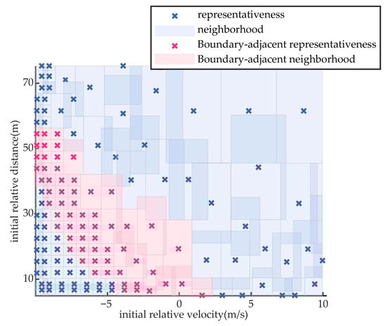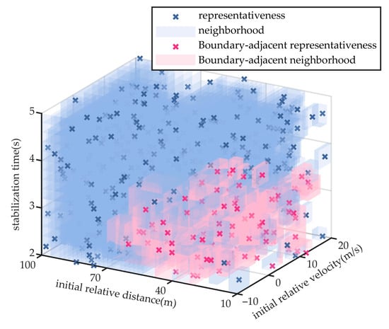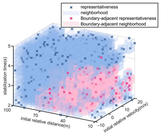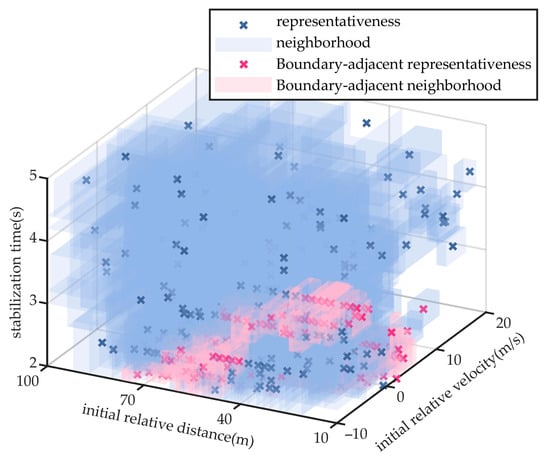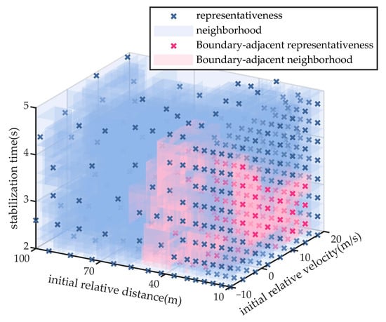 The proposed scenario compression and optimization method is employed to select representative concrete scenarios from the parameter space. In the leading vehicle braking scenario, the weight coefficients for relative velocity and relative distance in the influence radius analysis are set to 0.6 and 0.4, respectively. For the vehicle cut-in scenario, the weight coefficients for relative velocity, relative distance, and cut-in stabilization time are assigned as 0.4, 0.3, and 0.3, respectively. The representative scenario parameters and their corresponding neighborhood coverage results for the two types of scenario generation are illustrated in Figure 7 and Figure 8. Among them, scenario parameter points near the performance boundary of the automated driving system are highlighted with distinct colors.