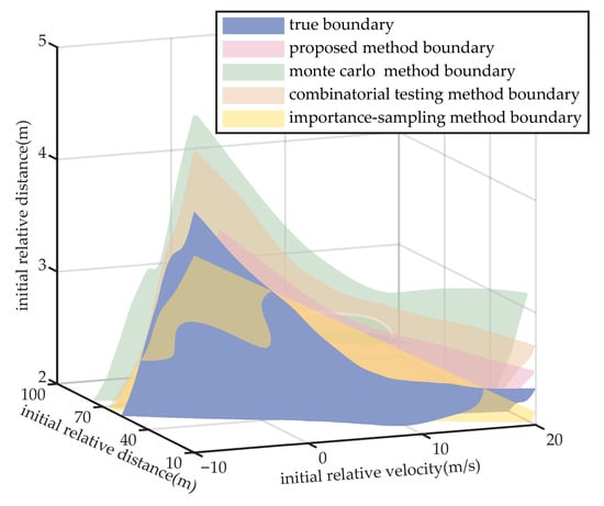Furthermore, in order to quantify the difference in scenario effectiveness, a co-simulation platform based on Python 3.9, PreScan 2021.3, and CarSim 2020.0 is established to obtain the test results. The truth boundary of the system is derived by fitting 193 parameter points located near the collision–noncollision division (points with risk indices corresponding to minor collision and near-collision) identified in the previous exhaustive testing results. These scenarios and their parameter locations are used as sampling points to calculate the RMSE between the true system boundary and the boundaries generated by the four scenario generation methods, which serves as the quantitative evaluation metric. As the parameter dimensions differ in units and scales, they are normalized to the [0, 1] range to eliminate the influence of scale differences []. The boundaries are illustrated in Figure 12, with the corresponding RMSE values summarized in Table 4.